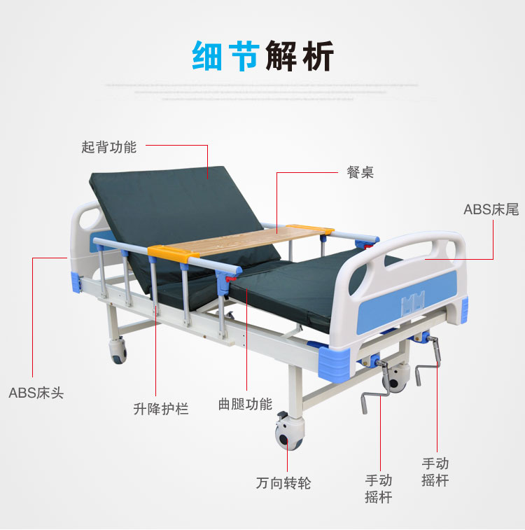 護理床有電動和手動之分,手動適用于病人一個短期的護理需要,在短期里解決一個護理難問題。電動適用于家里有長期臥床行動不便病人的家庭,這樣不僅大大減少了護理人員及家人的負擔,最重要的是這樣患者可以自己操作控制自己的生活大大提高生活的信心,不僅在生命上完成了一個人的需求,還在生命質量心里上達到了自我滿足,有利于患者疾病的康復。